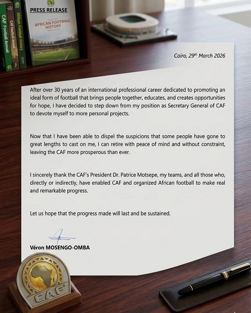أعلن فيرون موسينغو أومبا استقالته المفاجئة من منصبه كأمين عام الاتحاد الإفريقي لكرة القدم بعد أكثر من 30 عامًا في كرة القدم الدولية.