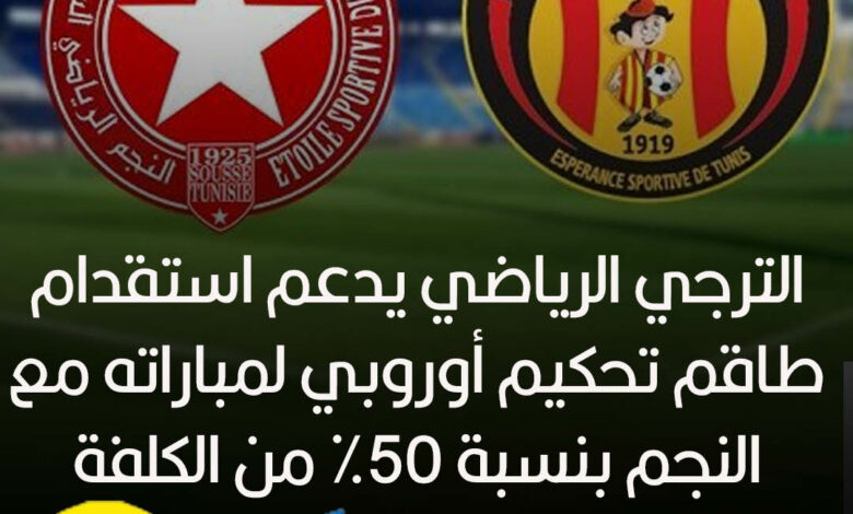 أعلن الترجي الرياضي التونسي دعمه لطلب النجم الرياضي الساحلي لتعيين طاقم تحكيم أجنبي أوروبي كامل لمباراة الفريقين يوم 4 أفريل 2026 بسوسة، مع استعداده لتحمّل 50% من كلفة الاستقدام المقدّرة بـ50 ألف دينار.